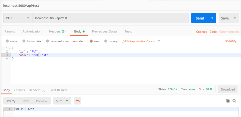 PUT : Handler에서 작성한대로 id, name을 전송하게 되면 id, name을 출력한다.