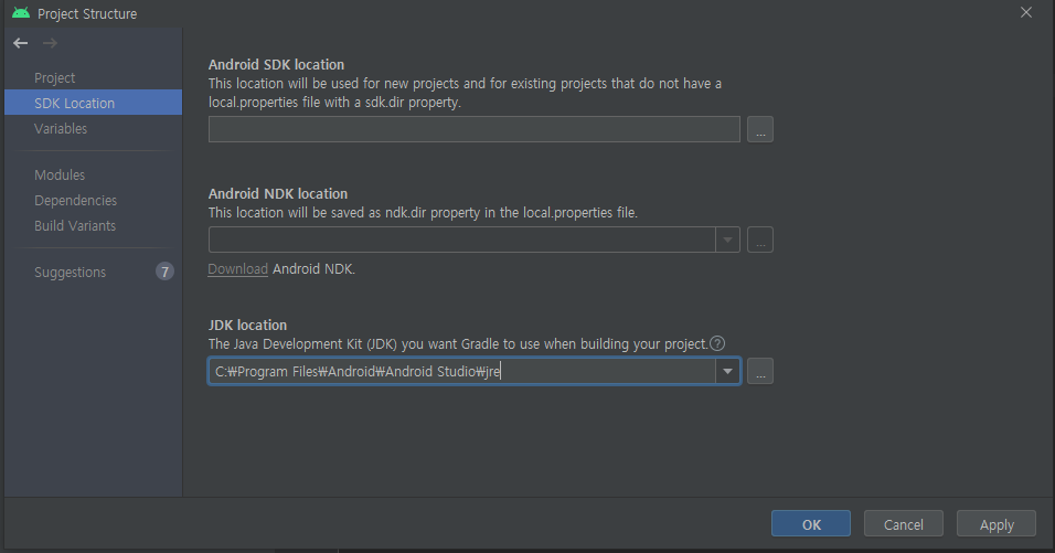8. 좌측 메뉴의 SDK Location 클릭 후 JDK location 확인