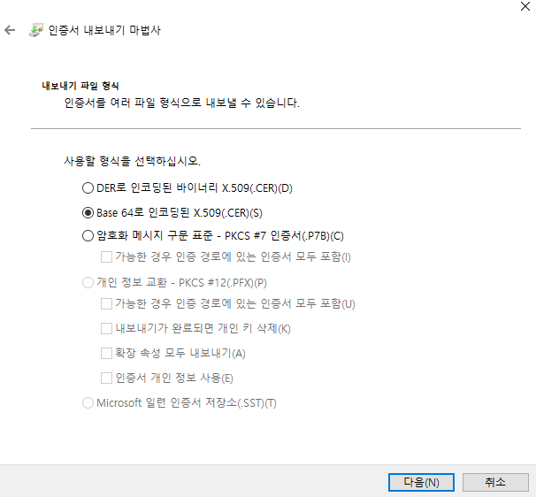 6. 인증서 내보내기 마법사에서 먼저 다음 누른 뒤 Base 64로 인코딩된 X.509로 바탕화면이든 아무곳에 저장