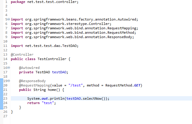 MVC패턴을 이용하는 Spring에서는 아래와같이 controller에서 불러오면 안되는 것은 아니지만 패턴의 규칙이 있기때문에 controller에서 직접 불러오는 것을 추천드리지는 않지만, 테스트목적이라 여기서는 불러서 사용합니다.